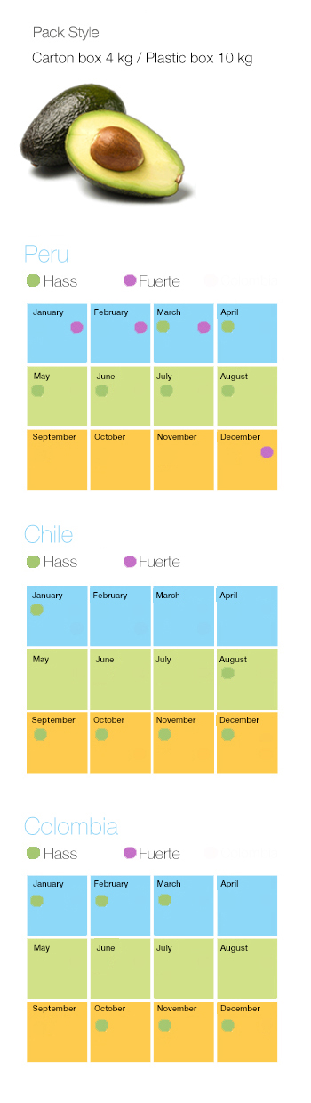 Originally from Peru, Chile and Colombia, Hass and Fuerte for export.