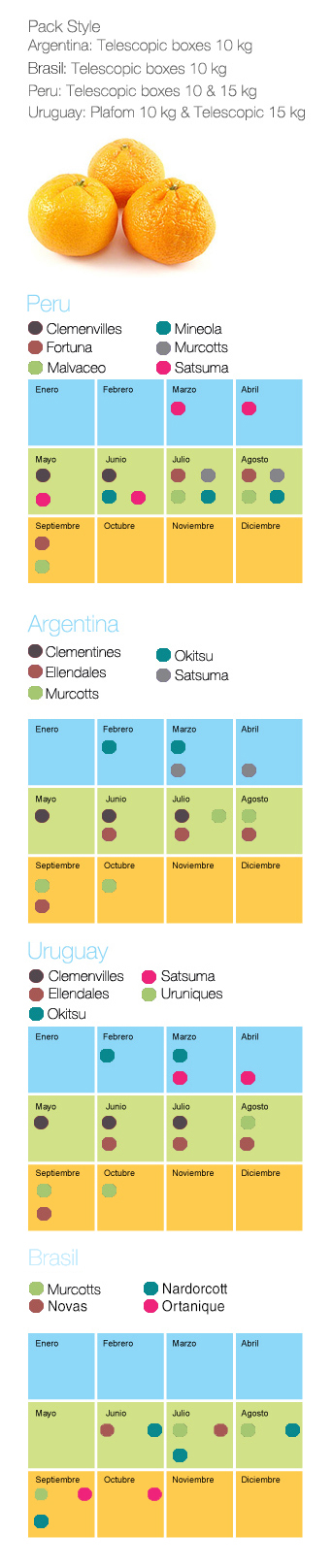 Con origen desde Argentina, Brasil, Perú y Uruguay, se exportan las variedades Satsumas, Clementines, Clemenvilles, Minneolas, WMurcotts, Murcotts, Malvaceos y Uruniques.