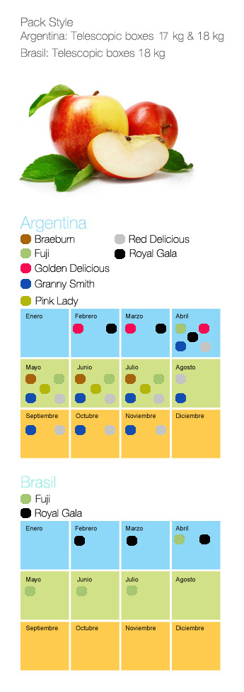 Con origen Argentina y principalmente y Brasil, se exportan las siguientes variedades: Red Delicious, Royal Gala, Braeburn, Fuji, Golden Delicious, Granny Smith y Pink Lady.