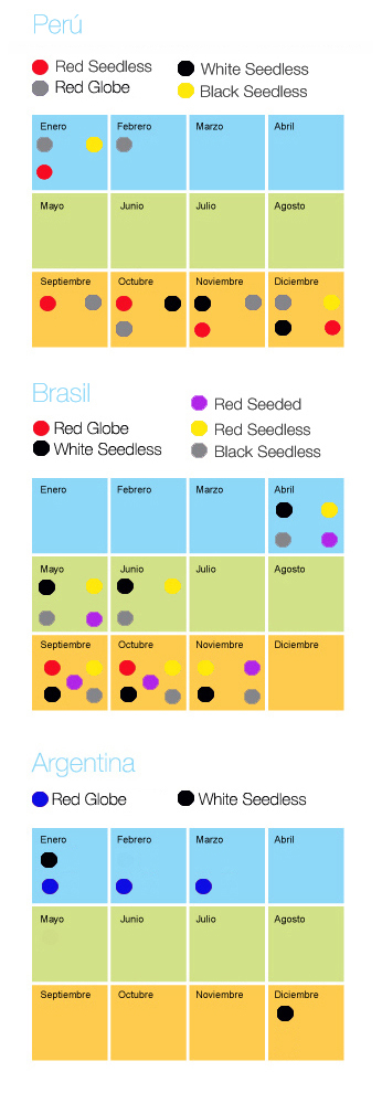 Con origen principalmente de Perú, y Argentina y Brasil, se exportan las variedades de White Seedless, Red Seedless, Black Seedless y Red Globe.